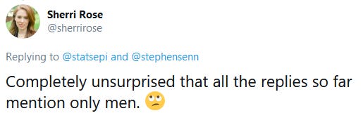 On a final note, I want to point out that for the trouble of tweeting this reminder, a handful of people replied to Sherri, complaining that it wasn’t constructive, or that she should offer some suggestions herself. Now, while I can understand why someone might at first think it reasonable request for her to add some female examples, I can also see how irritating (to say the least) that would be when it always falls on you to do it. Beyond this, there were the more intentionally inflammatory or dismissive comments, such as the suggestion that she was being a “snowflake”. Unfortunately this kind of “reply-guy” response is immediately recognizable to anyone paying attention. It is impossible for me not to notice after 10 years on the twitter that a lot of our colleagues would simply prefer to lurk, because engagement can so often lead to a flood of needlessly annoying interactions, or even verbal abuse and physical threats. Why would anyone bother? And so #StatsTwitter gets a bit more homegenous, and we are all worse off for it, as experts with important things to share decide it’s simply not worth it to engage.